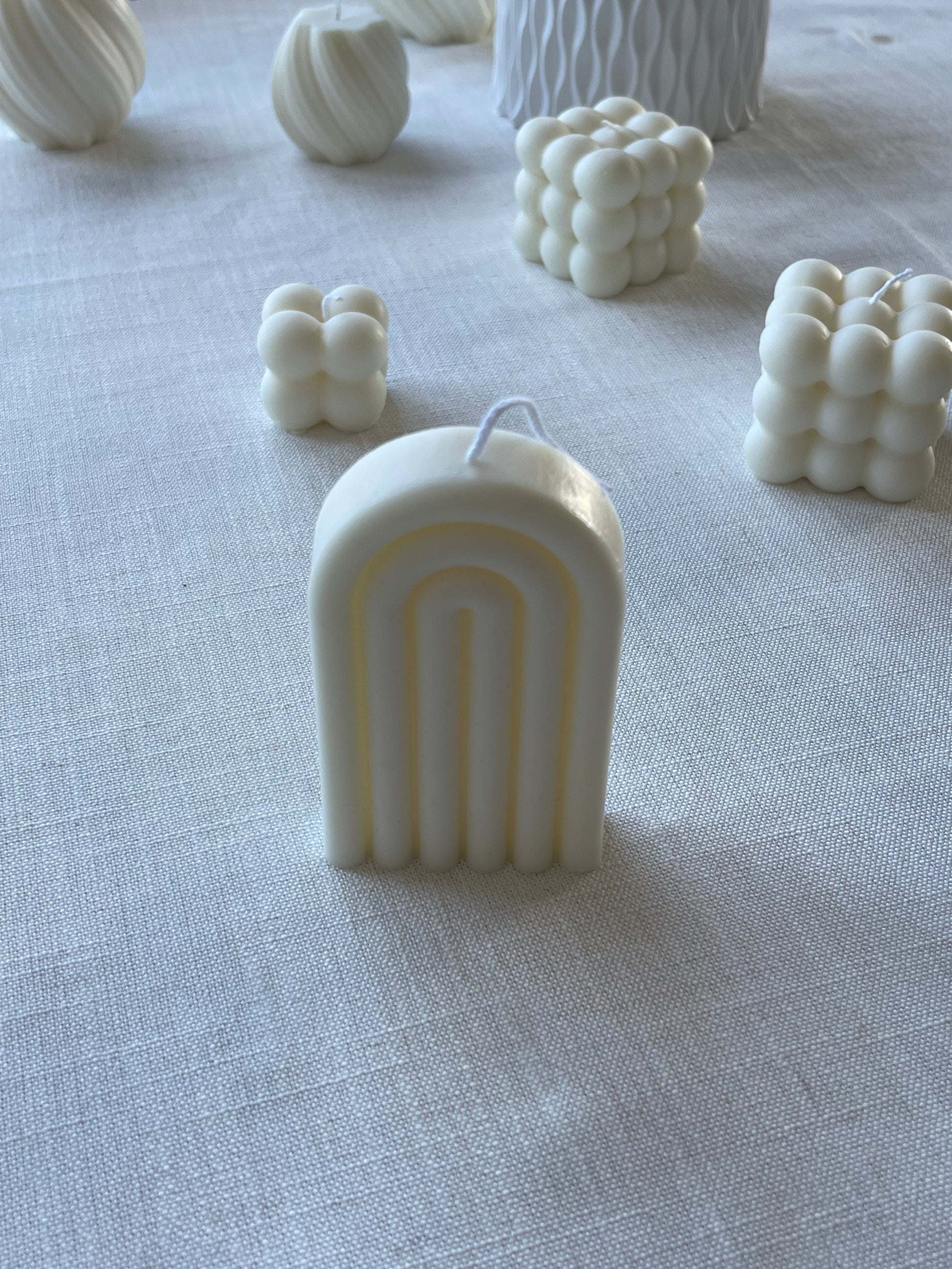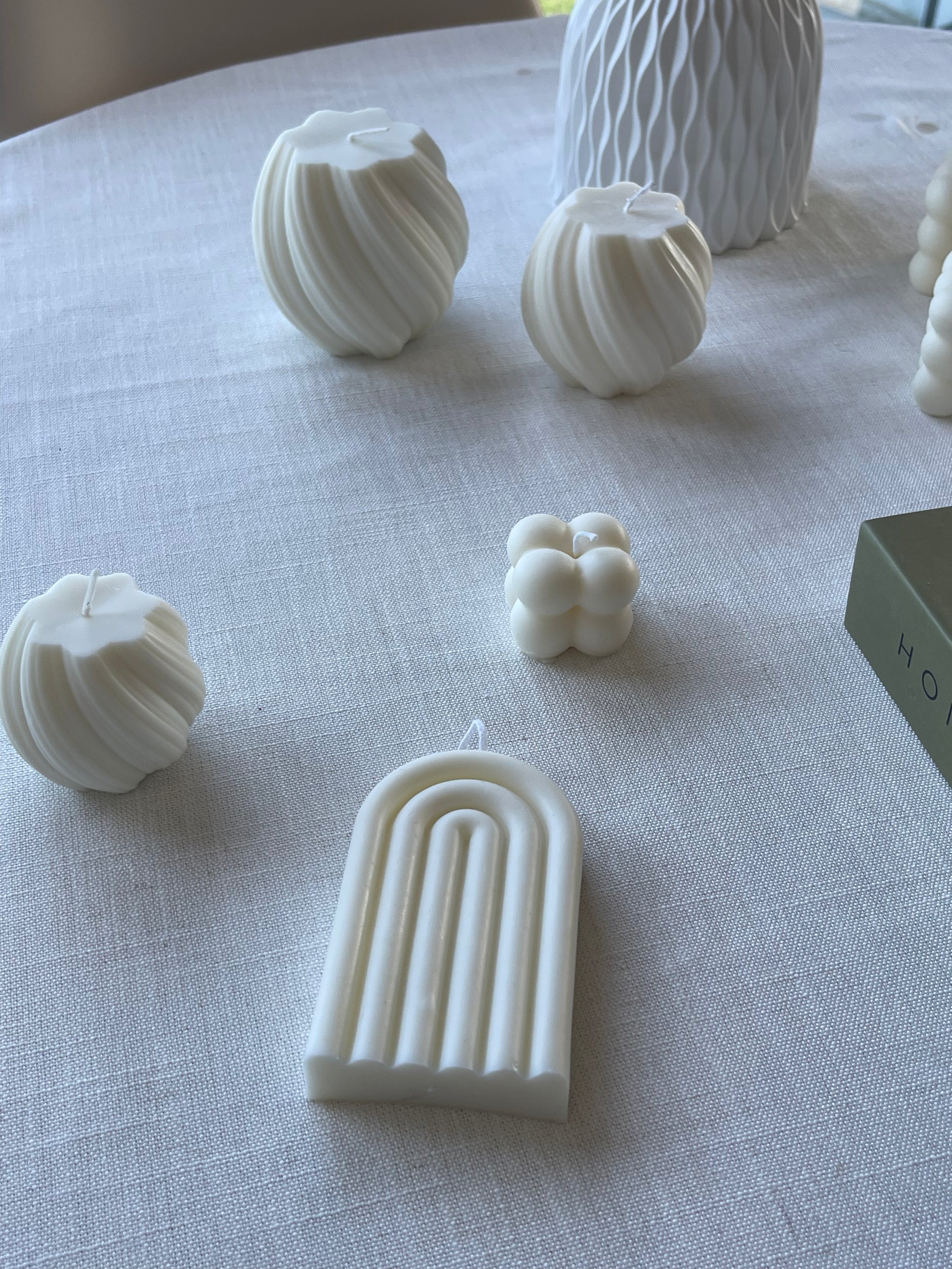 Su silueta curva y diseño evocan calma y armonía. Elaborada con cera de soja natural y sin perfume, en color blanco puro, es una pieza versátil que decora con sutileza cualquier rincón.