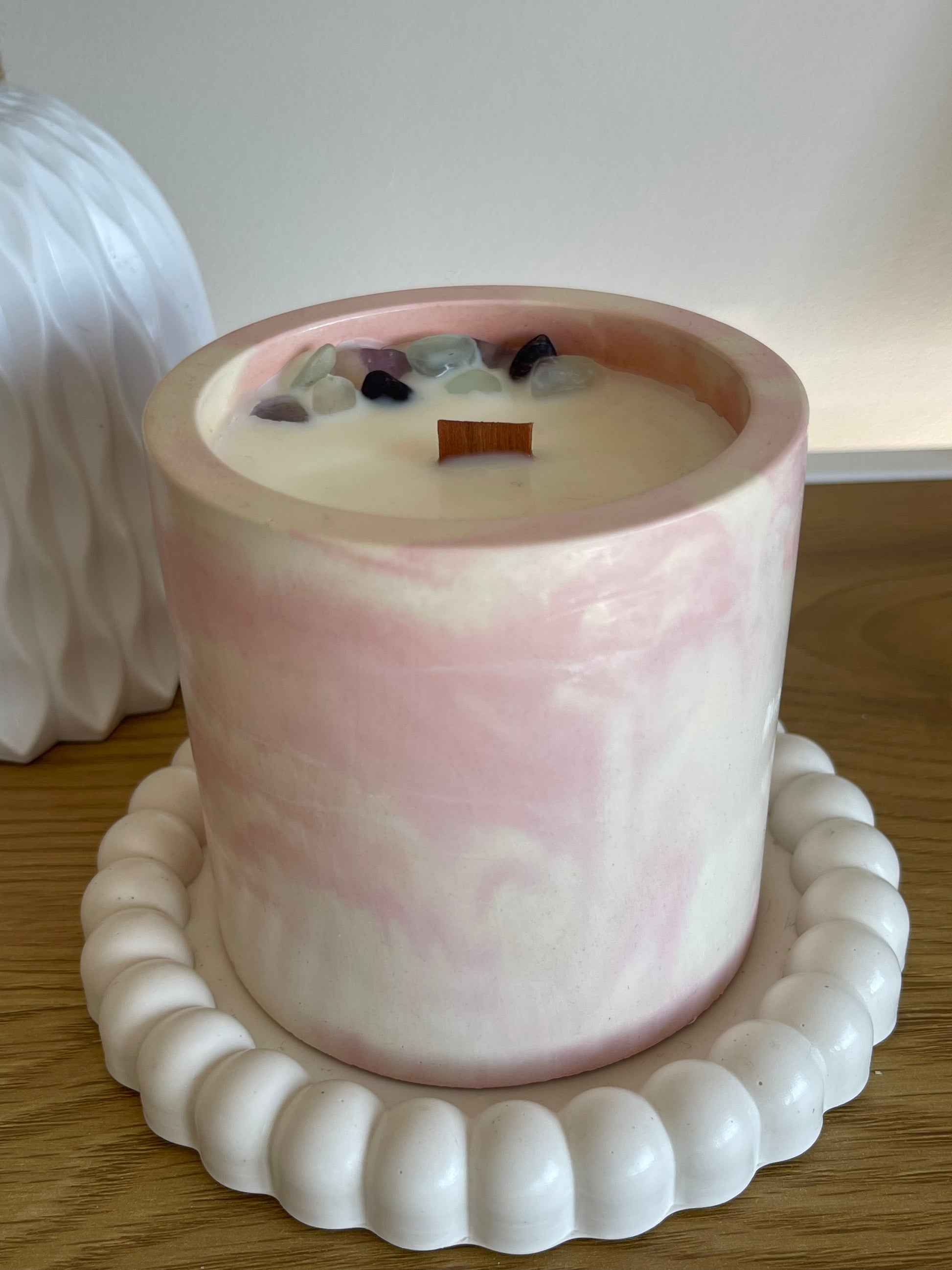 Vela hecha a mano con cera 100% de soja, fragancia vegana y libre de ftalatos. Cada envase es vertido y barnizado a mano, convirtiendo cada pieza en un objeto único. Disponibles en tres tamaños para adaptarse a cualquier rincón de tu hogar.